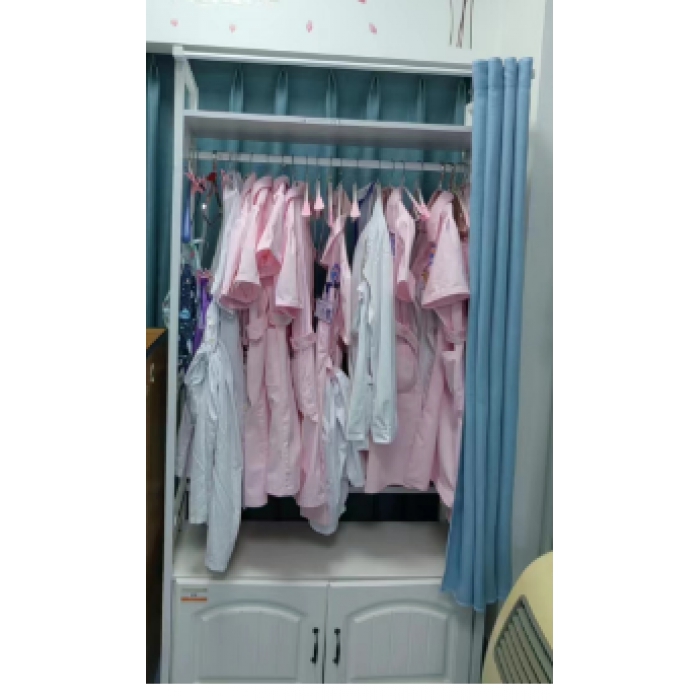 客户需求:备注:衣架框架为白色钢制,结构款式如图;顶部带顶板防尘作用,最下面为三聚氰胺板柜体,对开门形式如图;顶板下面带挂衣架,最前面带帘子