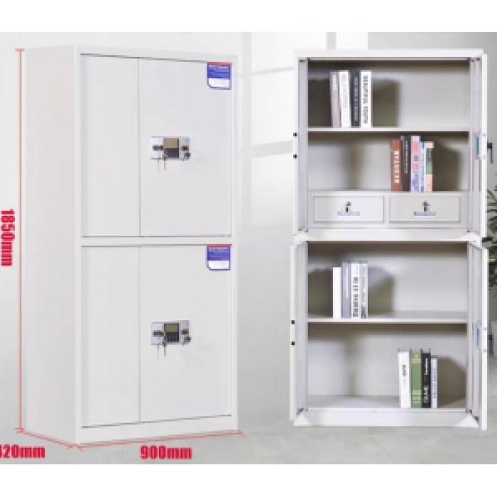 客户需求:1.上下均为对开门(柜内带两个抽屉,带锁),门内各三块活动搁板。 2.主要材料:柜体主要采用厚度1.0钢板。 3.门铰链采用高强度转轴结构,其中转套直径为Ф16mm,转轴直径为Ф10mm,坚固、可靠、无变形。 4.锁具:上下门各配一把电子密码锁(上、下、侧向三方位锁定),安全、可靠;