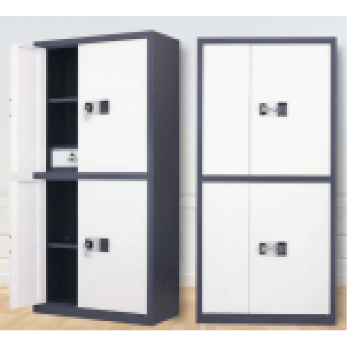 客户需求: 材质: 1.上下均为对开门(柜内带两个抽屉,带锁),门内各三块活动搁板。 2.主要材料:柜体主要采用厚度1.0钢板。 3.门铰链采用高强度转轴结构,其中转套直径为Ф16mm,转轴直径为Ф10mm,坚固、可靠、无变形。 4.锁具:上下门各配一把电子密码锁(所用密码锁品牌为国宝)(上、下、侧向三方位锁定),安全、可靠;