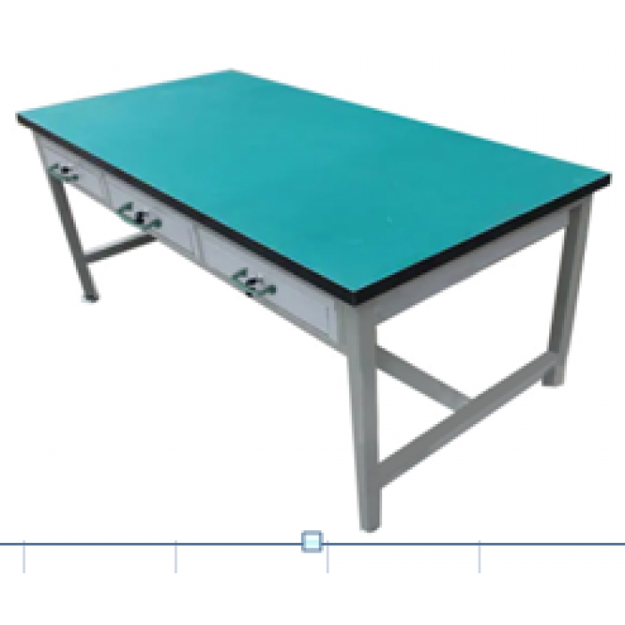 客户需求:1、桌面:实心理化板,桌面四周为圆角处理。桌面规格为13mm厚特抗板台面厚实芯理化板,边缘加厚至26mm板材表面釆用双面理化膜工艺,桌面带有同桌面大小的1.5mm水晶垫, 2、框架采用50*50*1.5mm矩形管高频焊接成型,横梁采用25*50*1.5mm矩形管高频焊接。3、抽屉采用1.0冷轧钢板折弯成型,导轨采用高承载式三节静音导轨。拉手采用一字拉手。双面各6个抽屉,一张打板台共计12个抽屉。
