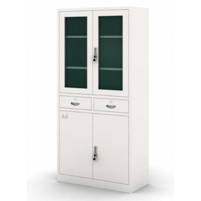 客户需求:1100mm×500mm×2200mm铁质,上部板式镶装4mm厚玻璃对开门,内设隔板2层,中间为抽屉,下部为板式对开门,内设隔板一层