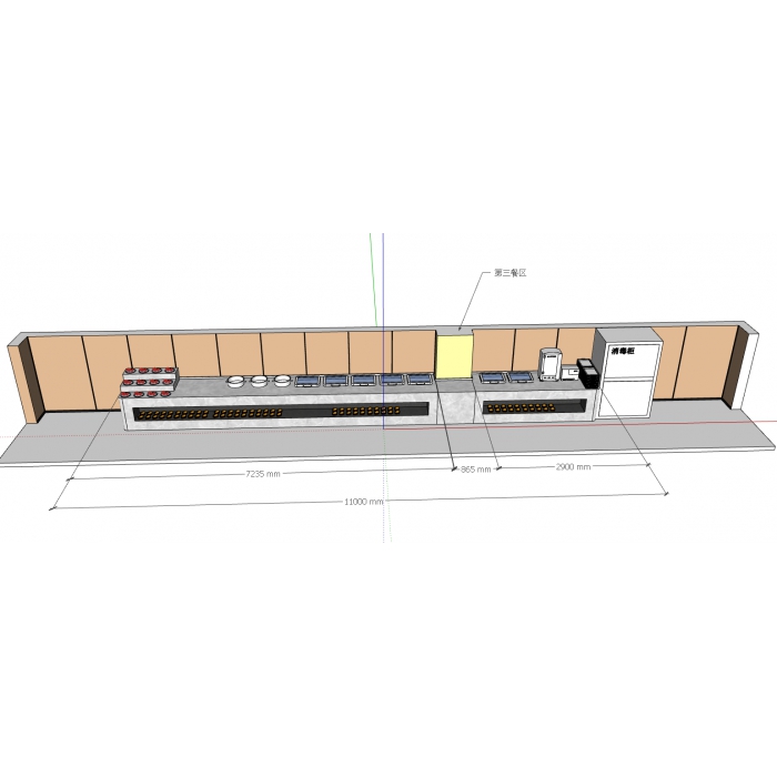 2612728,尺寸:7230*900*850,材质:钢架+防火板柜体+石英石台面,颜色:柜体塔科橡木,石英石颜色1013号