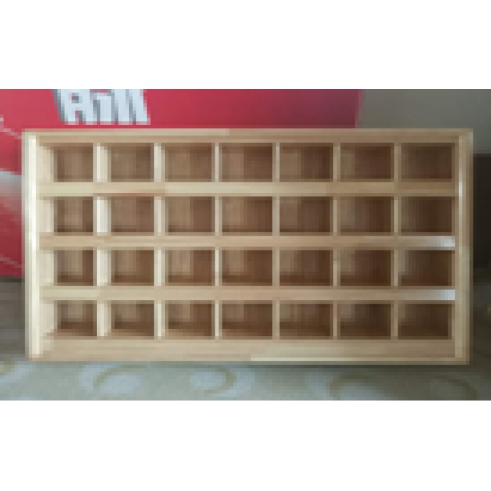 客户需求:木板周边厚度不低于2.4cm ,隔板竖的厚度0.8cm,横的5cm共计四层、每层7格,合计28个长方格。小格内径深12cm、宽10cm、高12cm方格,底边高7.4cm、长80cm,必须在墙面固定。整体带橡木背板厚1.8cm.需要加15CM底座