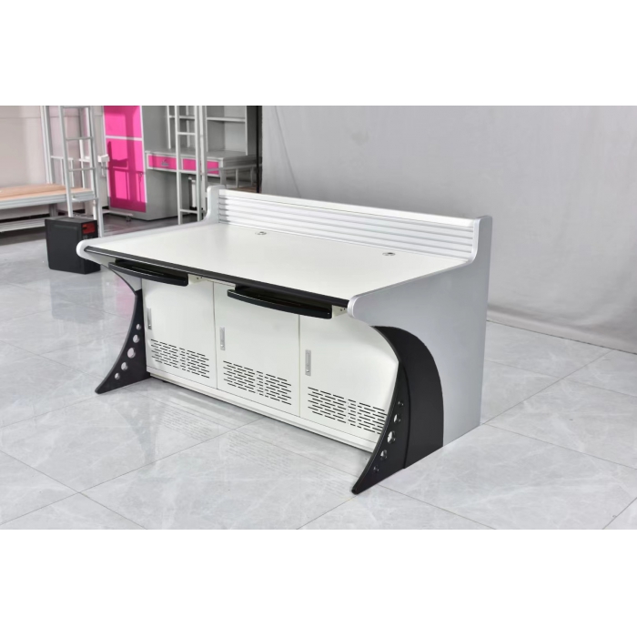 客户需求:1600*900*950,学习监管中心:AT-C平台每联长度600高度750加上铝型材总高度950,深度900,台面台面采用27mm厚E1防火板聚氨酯封边,没有甲酸释放,前后门采用AB403锁,框架采用1.5MM优质冷轧钢板 门托盘1.0MM,每联标配19英寸机架,后面铝型材,可装显示器万能支架,下面有可调地脚,抽屉扶手采用环保橡胶漆,前面台面有支撑防止台面变形,每联有链接孔可多联链接。尺寸说明:每联长度1600,台面高度750mm加上铝型材总高度950,深度900,防火板厚27mm,柜体钢板主承重框架厚1.5mm,钢板门厚1.0mm。 舒适的工作空间: 底柜采用超薄设计,底柜深度600mm,通过减少控制台与地面的接触面积来提高了操作员的伸腿空间。