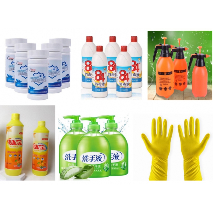 客户需求:泡腾片200瓶(消毒剂是泡腾片的核心成分,用于杀灭或抑制微生物的生长)、84消毒液1000瓶(84消毒液是一种高效的含氯消毒剂,主要用于物体表面和环境的消毒)、洁厕灵1000瓶(盐酸是洁厕灵的主要成分,作为无机强酸,它具有良好的去污效果,能有效去除卫生间内的污渍和尿垢),洗洁精50瓶、洗手液50瓶、喷壶2L50个,一次性手套、橡胶手套等
