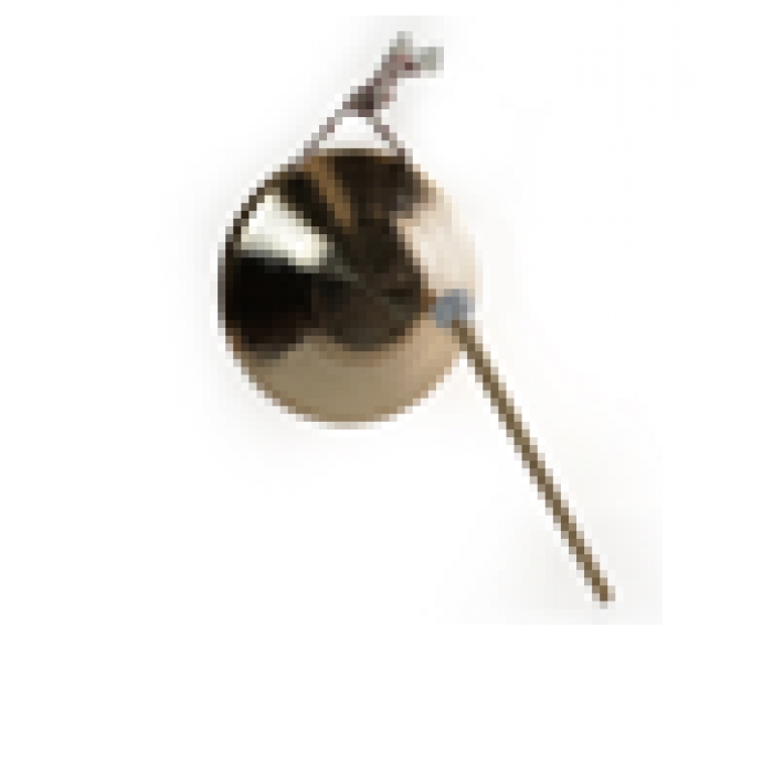 客户需求:"1.材质:优质响铜; 2.结构:小锣身为一圆型弧面,响铜制,中心部稍凸起,锣的内部中心位置印有商标,锣边缘开有两个小孔穿绳,方便使用 3.规格:锣直径为≧215mm,外延厚度≧1.5mm,木片长度≧265mm 4.使用方法:手持锣锤敲击锣面即可,锣音由敲击力度而改变"