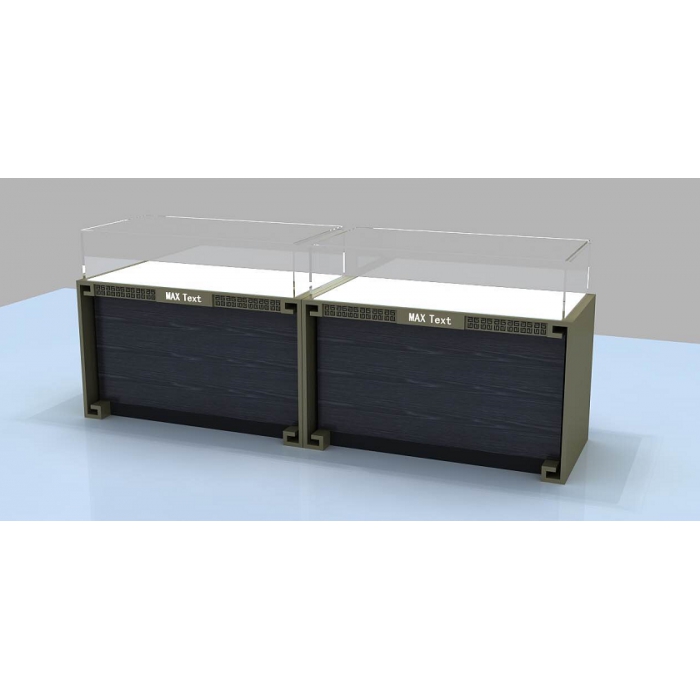 客户需求:玻璃展柜要求钢化玻璃可以抽拉,玻璃柜尺寸长1500*宽600*高300,木质柜体要求颜色为胡桃色尺寸1500*600*800,柜体带柜门加层板。 备注:三米展柜是靠墙放的