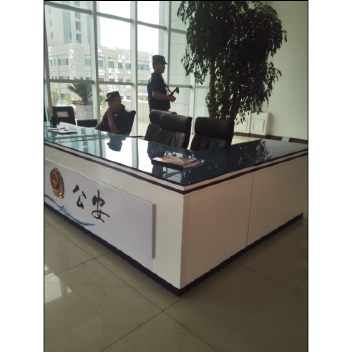 客户需求:接待台主桌桌面板为160mm的三层厚。颜色为白色烤漆。中间为蓝色。两块侧板为250mm,底座为650mm,(底座颜色为蓝色))桌面下面分两个格挡,右边为1400mm,左边为600mm。格挡板材160mm厚。副台为1.2米,右边3个抽屉,左边分4个格挡,侧板250mm厚,格挡和抽屉厚度均为160mm。