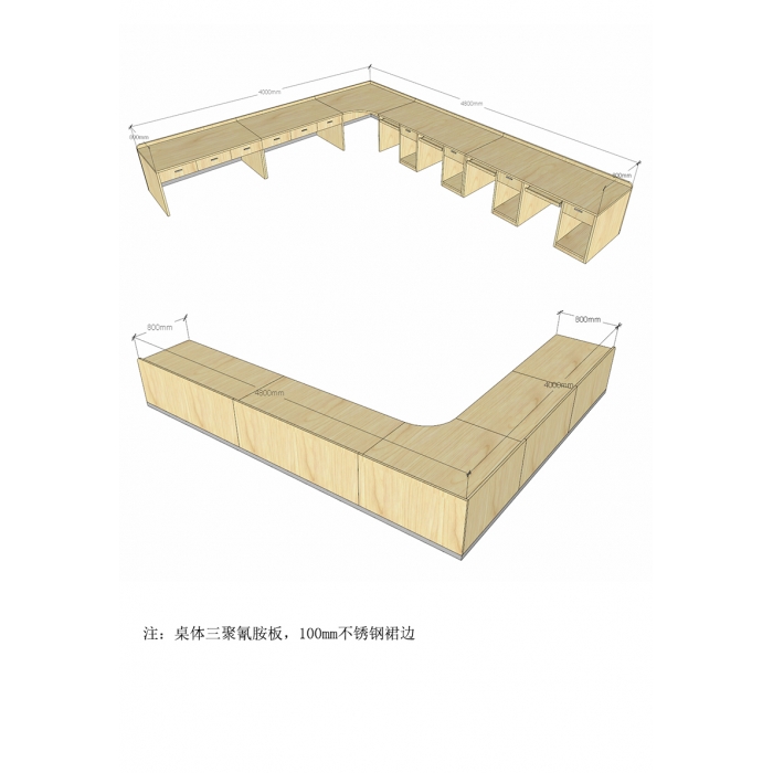 2699854,尺寸:4000*4800*800*760,材质:三聚氰胺板+不锈钢,颜色:百枫木色