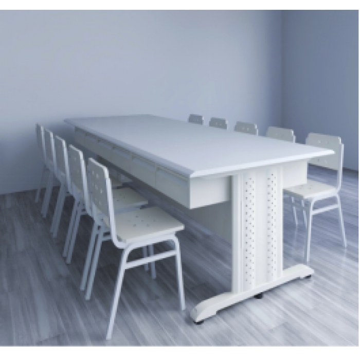 3111528,尺寸:3000mm*1200mm*800mm, #带抽屉(左、右侧各5个);不含椅子。,材质:钢制+防火板,颜色:钢制浅灰+防火板灰白色