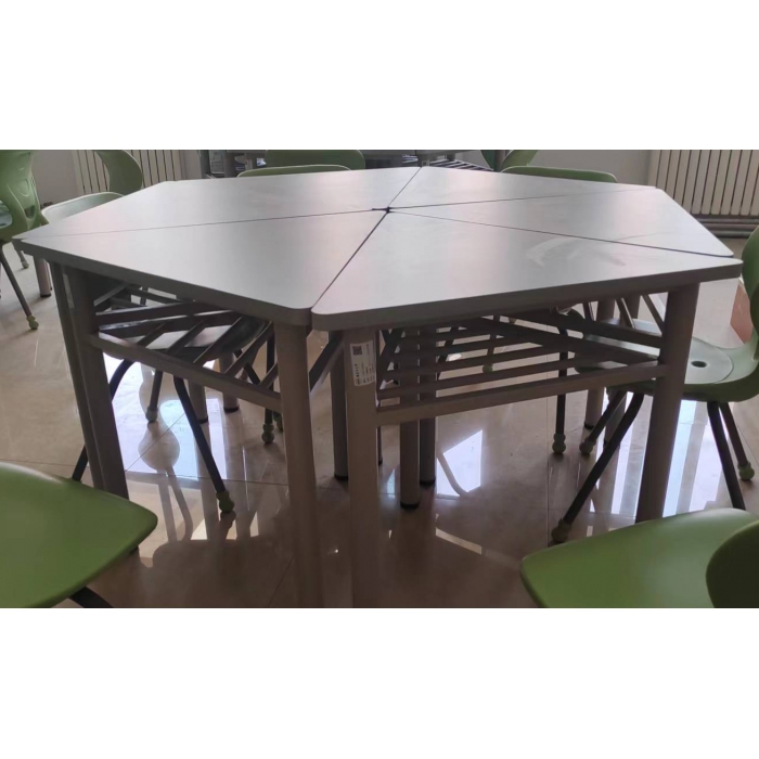 客户需求:1、结构:桌面形状为等边三角形,尺寸约为:边长800mm×高750mm。 2、台面:采用厚度25mm厚E1级纤维贴防火板,2.0mmPVC封边。 3、桌腿直径50mm圆形管焊制而成;静电粉末喷涂,钢板压筋焊合,配脚套,壁厚 1.5mm。 三角形桌可组合成六边形桌、三角形等任意组合的桌子。