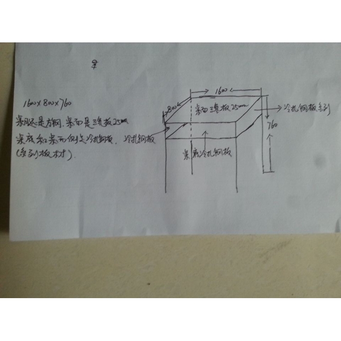 客户需求:桌架和桌腿按系列1212905尺寸和材质制作,桌面250mm三氢板,桌面和桌面下层距离200mm。桌面下层底板和桌子两侧板用系列冷轧钢板制作。