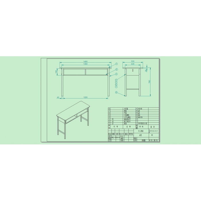 客户需求:桌面:E1级高密度纤维板,双面贴0.7mm弯曲防火板,其厚度25 mm,长边为圆弧边,短边2mmPVC高温封边。 桌斗:使用0.8mm优质冷板数控冲孔成形,桌斗净空高为150mm,净深420mm。 桌腿:40mm×40mm×1.5mm方管。 底套:采用工程聚丙防滑脚垫,自堵安装。 拆装式四腿落地双人课桌带挂钩。