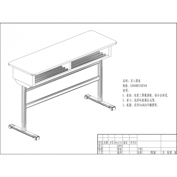 客户需求:如图连接梁更改为66*26胆管,桌斗左右带挂钩,桌面更改为25mm三聚氰胺板pvc封边。桌面颜色灰白。