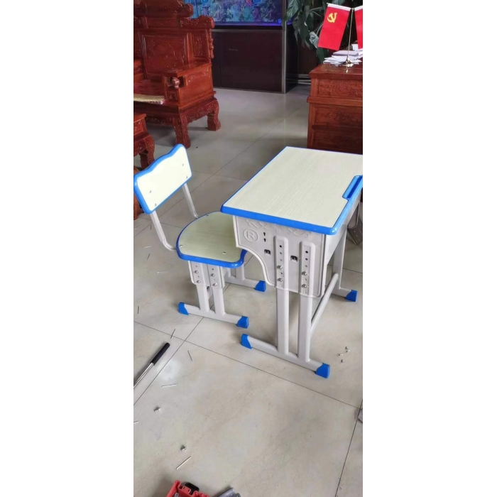 1、桌面:规格:桌面板外形的最大尺寸(含封边)长为不小于600mm,宽不小于450mm;基材选用厚度不小于18mm(不含封边)高密度中纤板面贴白橡木色防火板,四周兰色注塑封边。(桌面长、宽尺寸最大负偏离2mm)台面四周用工程塑料一次性整体注塑镶边,台面转角非直角处理,四角设计有安全圆角,桌面前方有注塑一体笔槽,笔槽长宽不小于205mm×18mm。封边、笔槽应一次注塑成型,不能采用胶水粘贴,防止脱落和学生随意撕毁。2、书斗:采用冷轧钢板冲压成型,壁厚不小于0.6mm。侧面设计有高度调节孔,书斗内空尺寸不小于长450×宽300×高170mm(长、宽、高最大负偏离2mm)。3、桌架:(1)立柱:采用扁平椭圆管与书斗配合使用,方便调节桌面高度。立柱¢不小于55mm×30mm,壁厚不小于1.2mm,立柱与书斗使用防松螺栓及螺母连接,保证课桌使用的稳定性;立柱高度调节不少于5档,调节孔距档位不小于30mm;(2)支撑脚:桌架受力着地的支撑要求使用扁平椭圆管,¢不小于50mmx30mm,壁厚≧1.0mm,扁平管接触地面的投影宽度不小于15mm,保证课桌的稳定性。(3)立柱与支撑脚采用焊接方式进行连接,稳固耐用。4、脚垫:支撑脚脚底前后均安装防滑及防噪音的专用塑胶脚垫,脚垫采用整体一次性注塑成型,平稳、稳固、安全,不易脱落,保证课桌安放的平整。5、脚踏横档:采用扁平椭圆管制作而成,不小于¢45mm×25mm,壁厚不小于1.0mm。(二)升降课椅的技术要求1、椅面:椅子靠背及椅面基材选用厚度不小于18mm(不含封边)高密度中纤板面贴白橡木色防火板,四周兰色注塑封边。靠背外形尺寸不小于380×170mm,椅座面外形尺寸不小于400×360mm。2、椅架:(1)立柱:立柱采用扁平椭圆管制作而成,立柱规格不小于¢55mm×30mm,壁厚不小于1.0mm;立柱配合冲压成型的冷轧钢板进行高度调节,立柱与冷轧钢板间使用防松螺栓及螺母连接,保证课椅使用的稳定性;双立柱高度调节不少于5档,调节孔距档位不小于20mm;(2)支撑脚:椅架受力着地的支撑要求使用扁平椭圆管,¢不小于50mmx30mm,壁厚≧1.0mm,扁平管接触地面的投影宽度不小于20mm,保证课椅的稳定性。(3)立柱与支撑脚采用焊接方式进行连接,稳固耐用。3、椅脚垫:支撑脚脚底前后均安装防滑及防噪音的专用塑胶脚垫,脚垫采用整体一次性注塑成型,平稳、稳固、安全,不易脱落,保证课椅安放的平整。4、椅脚横档:采用扁平椭圆管制作而成,不小于¢45mm×25mm,壁厚不小于1.0mm