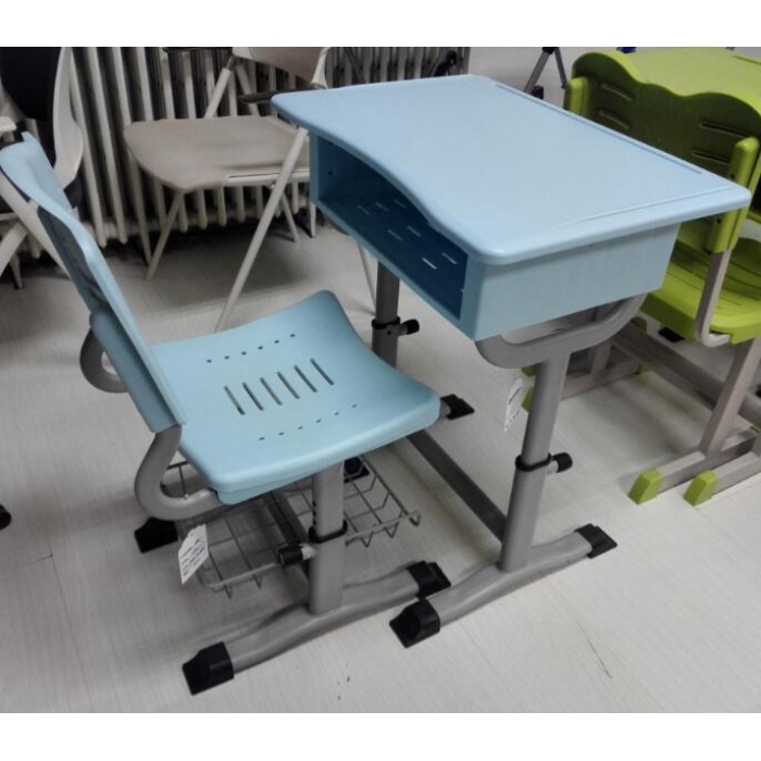 3311868,尺寸:650*450*760,材质:钢制桌架椅架、PVC材质桌面椅面。,颜色:深灰、浅天蓝