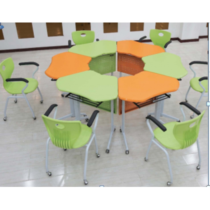 1、学生桌面尺寸:850(460)x590x18mm,采用环保E1级三聚氰胺板,桌面前端36度斜角,四周无接缝注塑包边。