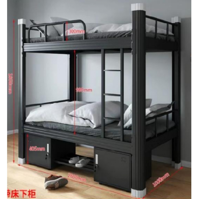 客户需求:产品说明: 1. 床立柱:采用75*75*1.5mm 滚压型材,在床腿的两侧各有一条宽5MM,深2MM 的梯形加 强筋;型材开口处折弯压死边处理,立柱上下两端使用高强度聚氨酯材料封头,整体安装 方便,稳固结实;型材内外双面喷塑处理。 2. 床帮:采用截面外径80*30*1.5mm 滚压型材,外侧面有两条宽5MM深2MM的加强筋。 3. 床挂件钢板:规格为200*30*2.0mm优质冷轧钢板冲压折弯成型。 4. 护栏弯管采用Ф25*1.5mm圆管,护栏竖管采用Ф20*1.5mm圆管。 5. 床板横撑采用矩管30*20*1.2mm,五根均匀分布,两端有锁定床撑功能,不易随便滑动、拔 取。 6. 床板采用厚度12mm 优质实木多层板,每个床位带厚度50mm椰棕床垫。床板甲醛释放量符合国家环保标准。 7. 床梯采用三层直梯,踏板的厚度为1.5MM 的冷板并做防滑处理。 8. 床下带两个单门储物柜,中间配置共用鞋架。 9、颜色:浅灰色。