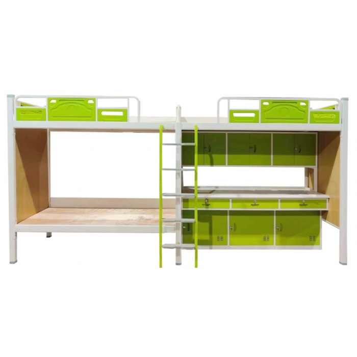 客户需求:立柱65*65*1.8mm八角管,横梁30*90*1.5mm管材,自制挂件,床帮护栏:床帮护栏横管、竖管采用优质方管制作,,护栏结构下部面板采用高密度聚乙烯冲压成型,单个护栏长度不得小于1400mm,高度不得低于300mm,护栏与床头缺口不得大于600mm。后床帮护栏:床铺靠墙体处增加采用优质冷轧钢板制作的档絮板,壁厚0.8mm,高度150mm。床头:封板采用优质高密度聚乙烯冲压成型。左中右床头均加装三聚氰胺木封板,厚度12mm。上床挡板:经设计,将上床中间设置挡板,挡板长度≥500mm,以防被褥互相影响;挡板带环形拉手。床板下横衬,数量7根均匀分布,管材规格30*20。两端带塑料套。床板厚度12mm。封边处理。床梯:采用爬梯,国标管材,竖梁采用壁厚1.5mm方管制作,管径30mm×30mm,踏板采用厚度为1.5mm的冷轧钢板制作,踏板尺寸370×85mm,内径尺寸加宽加深;五层踏板表面做防滑凸点处理,增加接触面;踏板表面加装PVC防滑胶垫。11.书架:,横向三节,带平开对开门,每节三个独立空间,中间位置设置竖向隔板,左侧中间位置设置横向隔板与竖向隔板相连;桌面:采用优质冷轧钢板制作,厚度0.8mm;内衬优质实木颗粒板提高桌面平整度。桌面后方加装档条,高30mm,13.桌下柜:采用优质冷轧钢板,柜体分三节,拉手采用内凹拉手,采用明锁扣,柜门内装有减震垫,以减轻关门时的噪音,采用可拆卸隐藏式静音镀锌合页;柜深400mm,右侧开启;