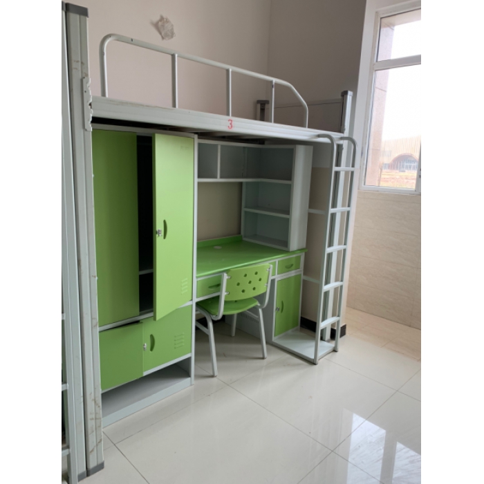 公寓床除衣柜柜门、抽屉(中间抽屉设锁)、桌面、桌下小柜柜门为绿色其余为暖白色。