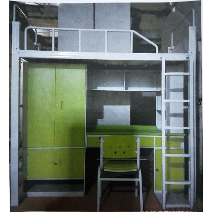 6.柜体宽边工艺,书架、桌体、柜体采用0.8冷轧钢板,后背板用0.5,抽屉0.6,普通三节式导轨,书桌中间抽屉带明锁扣,两边抽屉不设锁,衣柜外侧带两个挂衣钩,桌下小柜隔板不可调(隔板暂不配),柜门带明锁扣锁,床梯与桌下柜连接钢板采用0.8钢板;桌面为25mm刨花板贴防火板。(颜色为绿色)桌面前圆后直,靠墙带50mm挡笔条,颜色和材质同桌面一致。