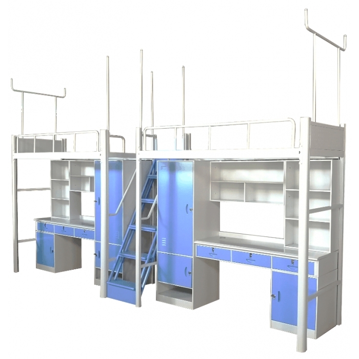 客户需求:1. 床立柱:采用68*68*1.5mm 滚压型材,在床腿的两侧各有一条宽5MM,深2MM 的梯形加强筋 2. 床帮:采用外径80*30*1.5mm 滚压型材,外侧面有两条宽5MM深2MM的加强筋; 3. 床挂件钢板:规格为200*30*2.0mm优质冷轧钢板冲压折弯成型; 4. 护栏弯管采用25*1.5mm圆管,护栏竖管采用20*1.0mm圆管,护栏尺寸1600*250; 5. 床板横撑方管25*25*1.2mm,五根均匀分布,两端有锁定床撑功能,不易随便滑动、拔取。6.床下柜、书桌均为为0.7mm 的冷板;桌面为优质冷轧钢板制作,人体接触面鸭嘴边处理;桌斗采用0.7mm厚的冷轧钢板制作,抽屉采用三节式导轨,抽拉顺畅,结实耐用,衣柜带镜子,靠衣柜门的床立柱带防震垫; 7.床板为冷轧钢板冲压成槽型瓦楞状,矩阵冲孔,槽型宽度不大于50mm,深度10mm,带50mm厚床垫,环保椰棕,外包绿色帆布,带拉链 8.踏梯为中梯,踏板下带横梁,不要蚊帐架