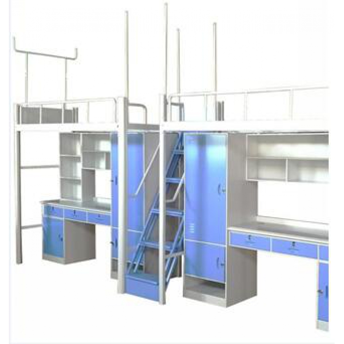 客户需求:柜门和抽屉门颜色为浅天蓝,其余为浅灰。书桌桌面0.7mm冷轧钢板、内衬胶合板,不带蚊帐杆。 1.床立柱:采用卡扣式型材 68*68*1.5mm。 2.床帮:采用型材外径 80*35*1.5mm 滚压型材。 3.床挂件钢板:规格为 200*30*2.0mm 优质冷轧钢板。 4.护栏弯管采用 Ø25*1.5mm 圆管,护栏竖管采用 Ø20*1.0mm 圆管,护栏尺寸 1800*250; 5.床板横撑方管 30*20*1.0mm 矩形管。 6.床板采用采用 0.7mm 冷轧钢板冲压成槽型瓦楞状。 7.踏梯为中梯,踏板采用 1.0mm 的冷扎钢板,踏板下带横梁 8.床下书柜、书架系列料厚,柜体采用 12mm薄边工艺,采用螺栓与床立柱连接,隔板均为活动式隔板,内置φ20mm 不锈钢挂衣杆,普通三节式自制导轨。 9.床头两端采用双面封板,封板为 0.7mm 厚优质冷轧钢板。