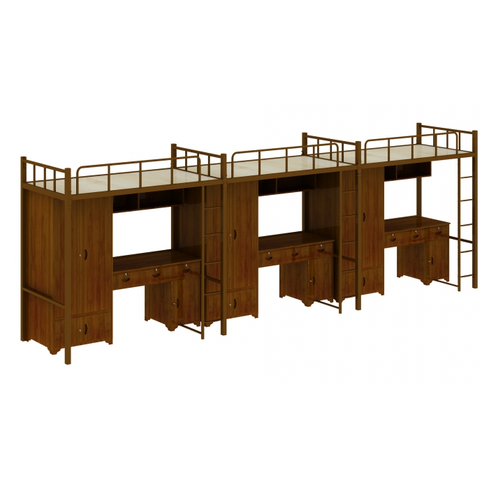 6、学习桌:床架右侧设学习桌,台面1200mm×550mm,桌高760mm。桌面采用0.8mm冷轧钢板制作前方带鸭嘴型,配带3个抽屉(采用三节式导轨)、一头沉书柜,抽屉、书柜采用0.8mm冷轧钢板制作,抽屉和书柜门带铝合金扣手,加明锁锁扣。