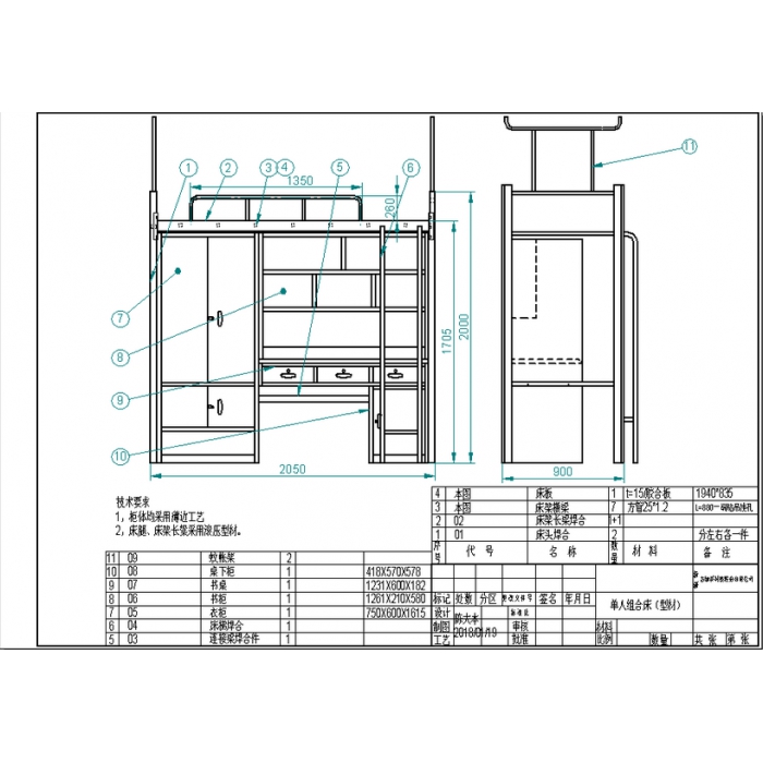 客户需求:单人组合床(型材)主要材料:床腿、床邦采用厚度1.5mm型材;柜体1.0钢板;桌面防火板;床板15mm胶合板; 材质:钢制+防火板+胶合板 颜色:米黄+橘黄+原木色+木纹色
