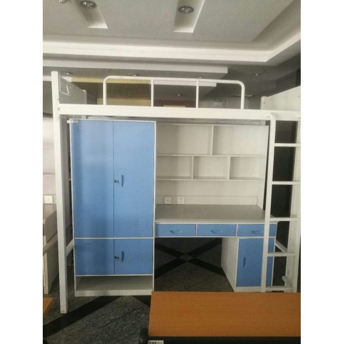 3611436,尺寸:2050*1200*2000,材质:床头采用50*50*1.5mm方管,床邦采用50*25*1.5方管,衣柜采用0.7mm优质冷轧板,书桌采用防火板,床板采用12mm优质胶合板,床横撑5根。,颜色:浅灰套浅天蓝