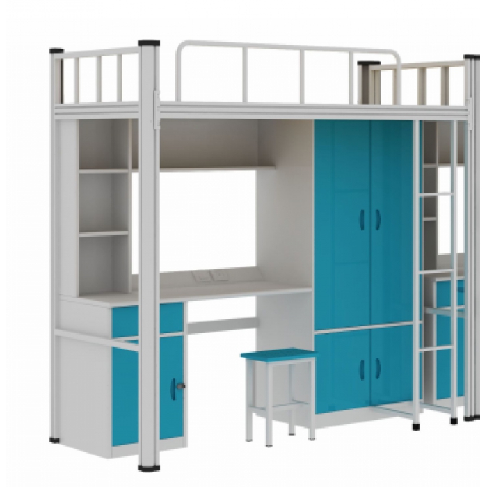 客户需求:床头采用50*50方管,床帮采用50*25方管,采用螺栓连接床板采用胶合板,不要方凳,床体颜色为浅灰,柜门为浅天蓝,衣柜内带挂衣杆,毛巾杆,梳妆镜,衣柜采用裙边腿,所有材料壁厚按公司系列料厚