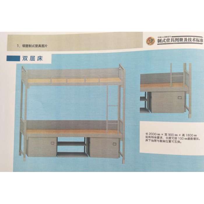 客户需求:材料大小和款式按制式营具执行,料厚按本公司常规料厚执行。下层床架靠床头两侧横梁下安装两个可拆卸的便携式折叠椅托槽(料厚2.0mm冷板,长50mm,宽80mm,外侧沿高5mm)螺栓固定,中心距300mm。
