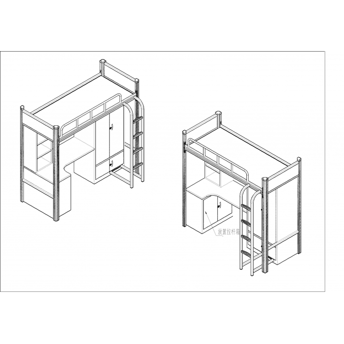 客户需求:1、上床护栏采用直径25圆管制作; 2、床梯采用30*30方管制作; 3、床横撑设计6根; 4、桌面采用(白橡木色)抗倍特板; 5、柜体采用薄边柜设计。