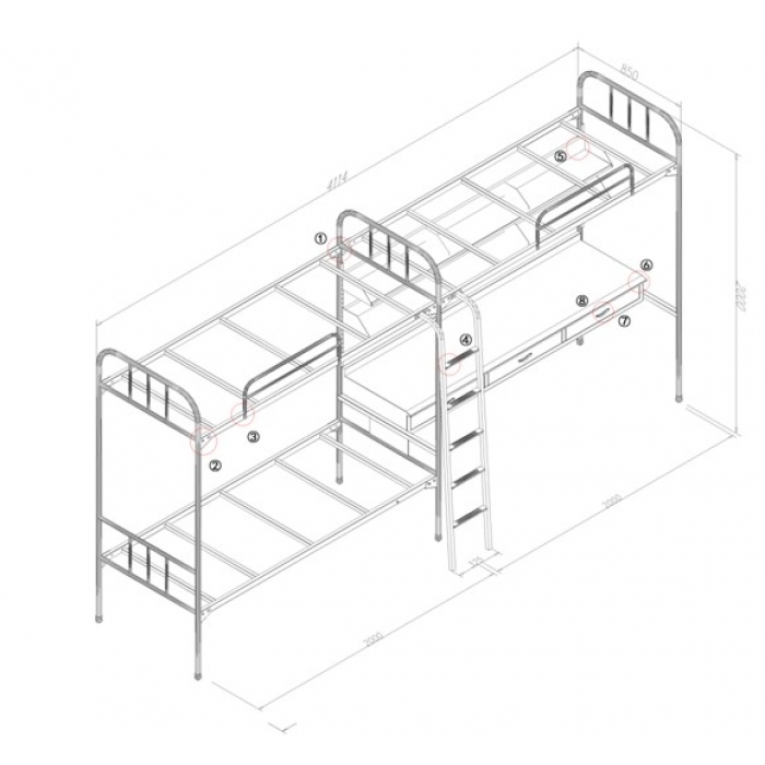 3611716,尺寸:4114*900*2000,材质:钢制,床头38*1.5mm,床架40*25*1.5mm,床横梁25*1.2mm(5根),写字桌桌面采用0.8mm冷轧钢板,书架采用1.0mm冷轧钢板,爬梯采用40*25*1.5mm矩形钢管,踏板采用1.0mm冷轧钢板,颜色:浅灰