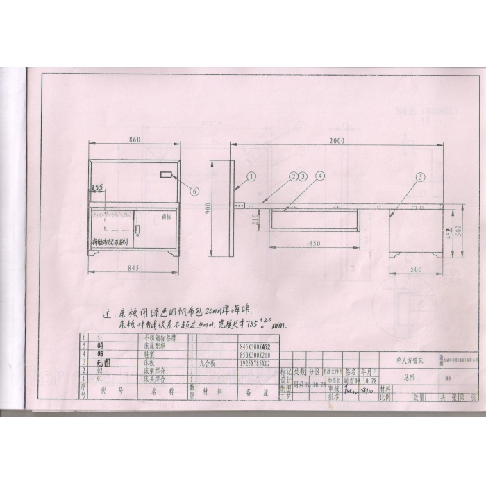 客户需求:床尾柜的深度500mm改为600mm,床板用中纤板,绿色细帆布软包20mm厚海绵。