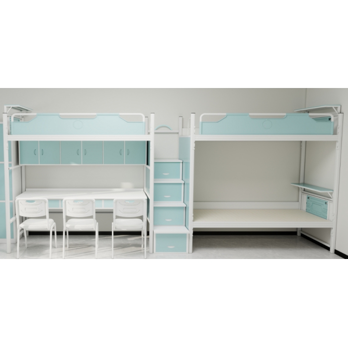 1.床立柱:采用截面规格尺寸为65*65mm管材制作,其中长边尺寸40±1mm,短边(斜边)尺寸18±1mm,交接处为弧形设计,消除锐角设计不伤人,管材采用厚度1.2mm优质带钢高频焊接闭口型材管,经成型线轧制而成,与床厅挂件采用三个面接触卡式(无螺栓)连接,更好的防止学生意外碰撞受伤,壁厚1.2mm,立柱上下端均采用优质PP塑料的静音高强度管塞,安全耐用。
