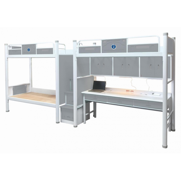 9.床梯:采用中间走梯,两侧加装木制封板,提高使用者隐私性,同时减少上下床产生的噪音。柜式带储物功能梯子,床梯踏板采用高强度防静电PE材料,中空吹塑工艺,分子量分布均匀,载重结构合理,抗冲击、抗老化、防褪色、具备抑菌、易清洁、耐腐蚀,并且有一定的韧性,底部预埋螺母,功能尺寸为500mm*225mm,厚度20mm,整体结构依据校舍实际使用需求,合理设计,有效加大使用空间。中梯上床侧加装上床拉环,增强使用安全性所有钢材均采用国家标准钢材,各钢件经除锈、酸洗、磷化等工序;