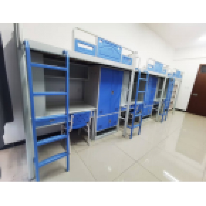 客户需求:名称:上床下桌,三位一体 规格:6000*900*2000mm(核心产品)1.结构:上部为床体,下部由书架、衣柜、书桌等组成;2.★床头立柱:采用规格为65*65mm八边形钢管制作;厚度1.2mm,立柱上下均采用优质PP塑料的静音管塞。3.床帮:采用30*90*1.5mmD型钢管制作而成,钢管下方为半径15mm的圆弧设计;4.床帮与床头立柱连接方式:采用优质钢板经冲压拉伸成型为梯形四齿挂件,挂件三面与立柱紧密贴合,成型后外框部分尺寸为240mm*(15mm+42mm+15mm),钢板厚度2.0mm。5.前床帮护栏:护栏外框采用规格为25*25方管制作,竖管采用规格为20*20方管制作,护栏结构分左、中、右三格挡,左、右两格挡分上、下结构,上部镂空,下部封板长x高x厚尺寸为350x147.5x22(±2mm),材质采用PE聚乙烯。中间封板长x高x厚尺寸为560x275x22(±2mm),材质采用PE聚乙烯中空吹塑一次成型,护栏内侧有床褥限高警示线,警戒线分两个刻度50mm100mm;护板外侧带云纹环形凹槽,云纹框内带圆形LOGO凹槽;6.后床帮护栏:采用系列厚的冷轧钢板,高度150mm;7.床头:采用长x高x厚尺寸为560x275x22±2mm;护栏内侧有床褥限高警示线,警戒线分两个刻度50mm100mm;护板配有一个储物槽,内空宽x高x深尺寸: 235x100x30mm;8.床板横撑:采用30*20矩形钢管,两端有锁定床撑功能;9.★床板:采用实木多层板,厚度12mm,全检。10.床梯:采用爬梯(落地,带斜坡,连床上夹角为80度),竖梁采用壁厚1.5mm方管制作,管径30mm×30mm,踏板采用厚度为1.5mm的冷轧钢板制作,踏板尺寸≥350×70mm;五层踏板表面做防滑凸点处理,增加接触面;踏板表面加装PVC防滑胶垫,。11.床下衣柜:隔板均为活动式隔板;内置不锈钢挂衣杆,门上冲压透气孔,侧置挂衣钩,柜体、隔板采用0.8mm钢板,锁扣采用内嵌隐藏式挂扣;12、书架:采用0.8mm厚冷轧钢板;13、书桌:桌面采用1.0mm优质冷轧钢板制作,锁扣采用内嵌隐藏式挂扣;內衬颗粒板;桌架采用40*40钢制方管制作,横撑采用40*25钢管制作; 14.颜色:床帮护栏封板、床头封板、衣柜柜门、抽屉、床梯踏板为浅豆绿+其余为亚光白色131—1参考前期料号:3511870