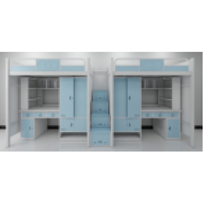 10.床下衣柜、桌下柜、书架:合页采用完全隐藏式镀锌合页,不允许外露;隔板均为活动式隔板;衣柜750*600*1630mm,内置不锈钢挂衣杆,门上冲压透气孔,侧置挂衣钩,桌下柜406*570*565mm,书架570*220*870mm、950*220*306mm;柜体、架体、隔板采用0.8mm优质钢板压制成型,柜门锁扣采用明锁扣;