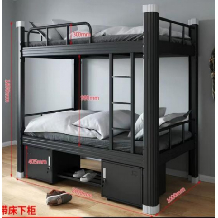 4.前床帮护栏:护栏外框采用规格为≥25*25*1.2mm 优质钢制方管制作,竖管采用规格为≥20*20*1.2mm 优质方管制作,护栏结构分左、中、右三格挡,中间为≥0.6mm 冷压封板,从两侧可以到上铺情况。