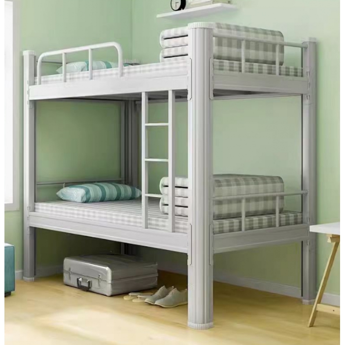 客户需求:客户需求:产品说明: 1. 床立柱:采用75*75*1.5mm 滚压型材,在床腿的两侧各有一条宽5MM,深2MM 的梯形加 强筋;型材开口处折弯压死边处理,立柱上下两端使用高强度聚氨酯材料封头,整体安装 方便,稳固结实;型材内外双面喷塑处理。 2. 床帮:采用截面外径80*30*1.5mm 滚压型材,外侧面有两条宽5MM深2MM的加强筋。 3. 床挂件钢板:规格为200*30*2.0mm优质冷轧钢板冲压折弯成型。 4. 护栏弯管采用Ф25*1.5mm圆管,护栏竖管采用Ф20*1.5mm圆管。 5. 床板横撑采用矩管30*20*1.2mm,五根均匀分布,两端有锁定床撑功能,不易随便滑动、拔 取。 6. 床板采用厚度12mm 优质实木多层板,每个床位带厚度50mm椰棕床垫。床板甲醛释放量符合国家环保标准。 7. 床梯采用三层直梯,踏板的厚度为1.5MM 的冷板并做防滑处理。8.颜色浅灰
