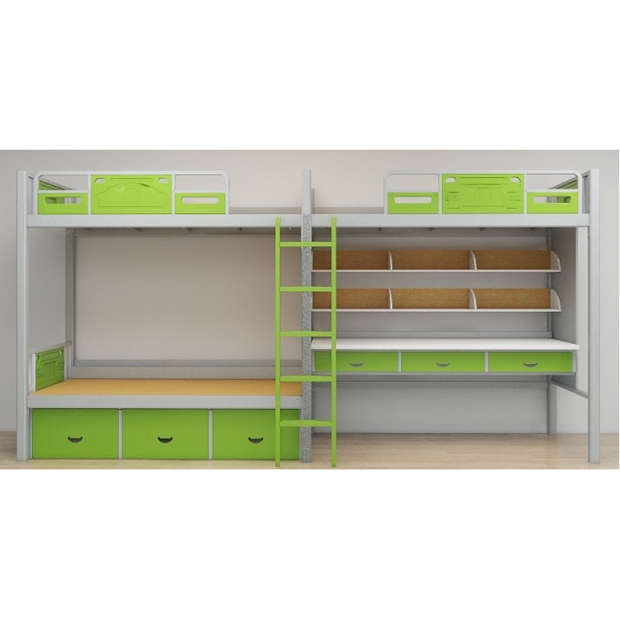客户需求:立柱74*74*1.5mm,前后床厅30*90*1.2mm,隐藏式挂件,床头封板钢制凸点封板,护栏自制钢护板。床板12mm胶合板,封边处理。采用落地爬梯,中空吹塑工艺,踏板表面防滑凸条。桌面25mm防火板,前端圆弧处理。床下悬挂鞋架,居中制作,分隔为三个独立空间。