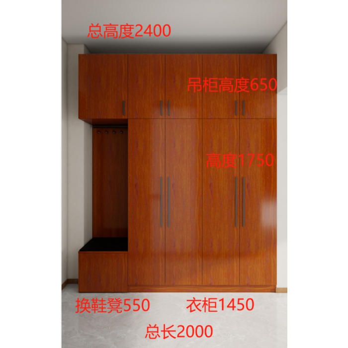 3712911,尺寸:1.衣柜:1450mm*540mm*2400mm 2.换鞋凳:550mm*540mm*2400mm,材质:中纤板贴防火板 +软包,颜色:7508-A6+黑色软包