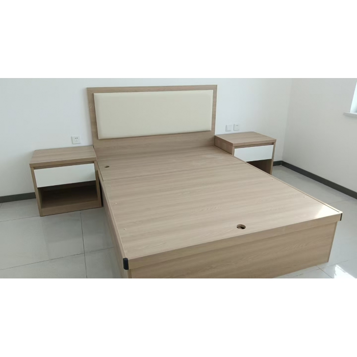客户需求:客户需求:床箱采用优质三聚氰胺板制作,床箱采用高箱床,长片和短片25mm,床撑18mm,床头带皮质软包。床体结构为高箱床,采用优质液压杆,带100mm床垫;