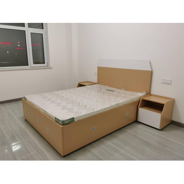 客户需求:床屏均采用25mm优质三聚氰胺板制作,床箱采用高箱床,侧板、床尾采用25mm优质三聚氰胺板制作,其余采用18mm优质三聚氰胺板制作,床箱内部设计成井字形结构分隔成多个储物箱便于储物,床板采用16mm优质三聚氰胺板制作;床箱三面增加散热透气孔,底脚采用优质钢制站脚支撑, 带50mm白色棕垫