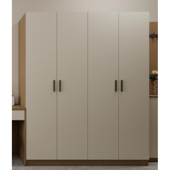5.衣柜采用四门设计,满足双人同时使用需求,内部采用上下分区结构,优化空间利用率,提升收纳效率;上方配置加粗挂衣杆,下方设双层储物格,可根据需求调整分区,适应不同尺寸物品收纳;柜体采用优质三合一偏心连接件连接,确保柜体稳固耐用;柜门配置优质液压缓冲合页,具备自动闭合功能,液压合页可实现柜门轻柔闭合,有效避免碰撞噪音,柜门加装符合人体工学设计的优质把手,握感舒适,安装牢固;