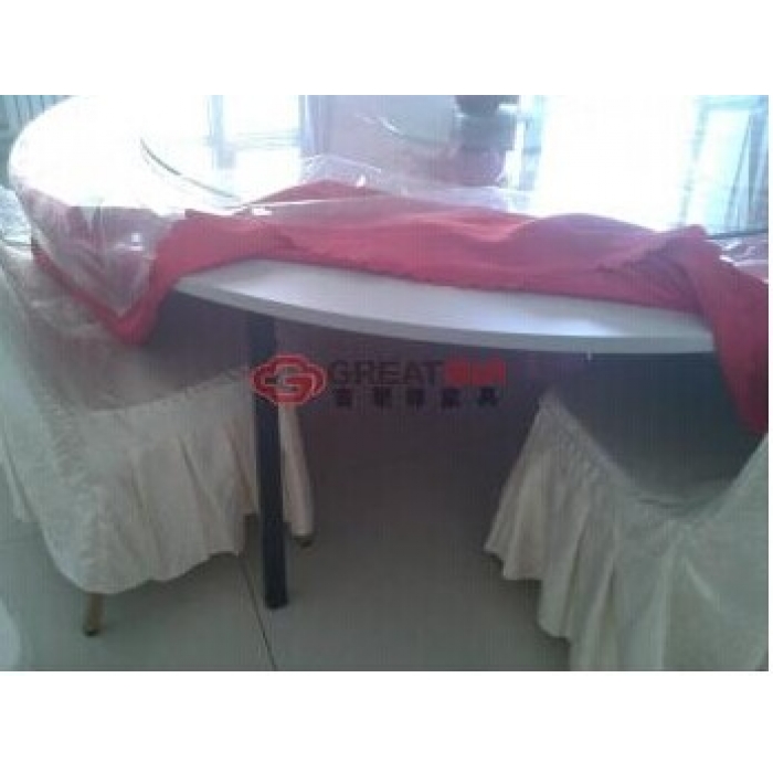 4111925,尺寸:¢1500*760,材质:三聚氰胺板+方管桌架+玻璃转盘转芯+桌布,颜色:浅灰色桌面、黑色桌架、红色桌布