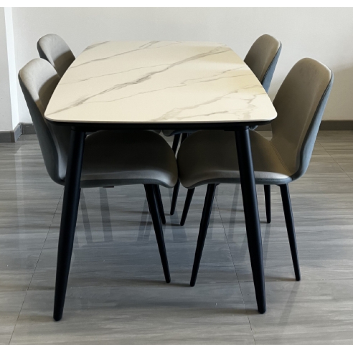 4199706,尺寸:1200*600*750mm,材质:餐桌:岩板+钢制 餐椅:钢制+环保皮,颜色:餐桌:灰色+钢制黑色桌脚 餐椅:灰色