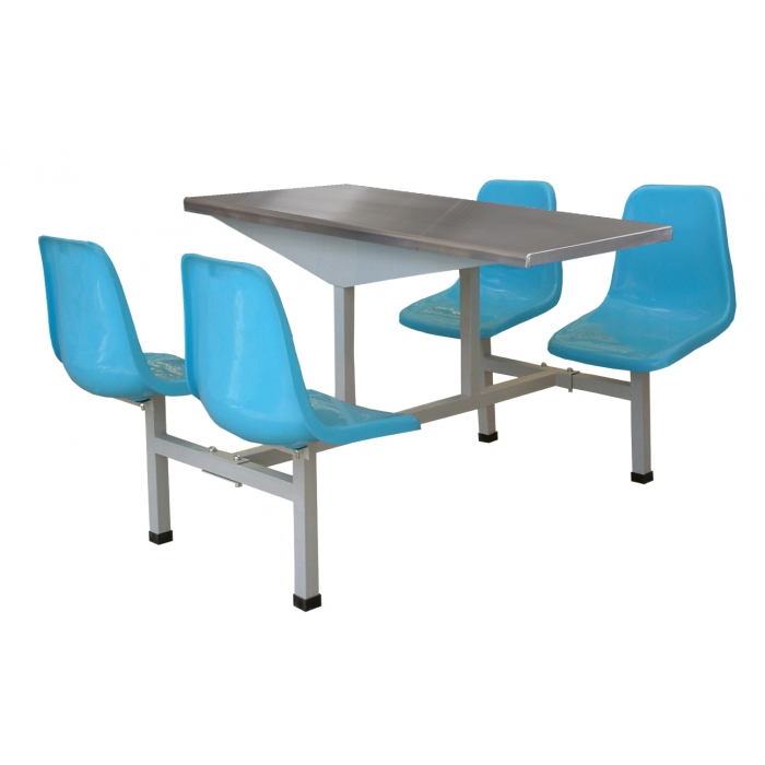 4311985,尺寸:1200*1660*750,材质:钢制框架,25mm刨花板外包不锈钢板桌面,玻璃钢椅面,颜色:不锈钢(桌面)/浅灰(钢架)/天蓝色(椅面)