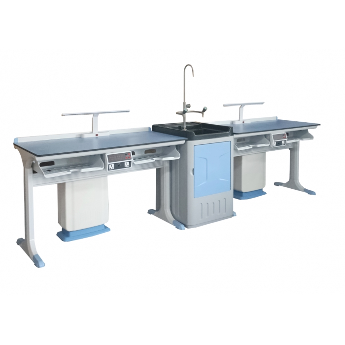 2.每两个学生中间,面板采用阻燃ABS制作,选用进口PC贴膜,美观耐用。接受教师演示台送来的交流电源。